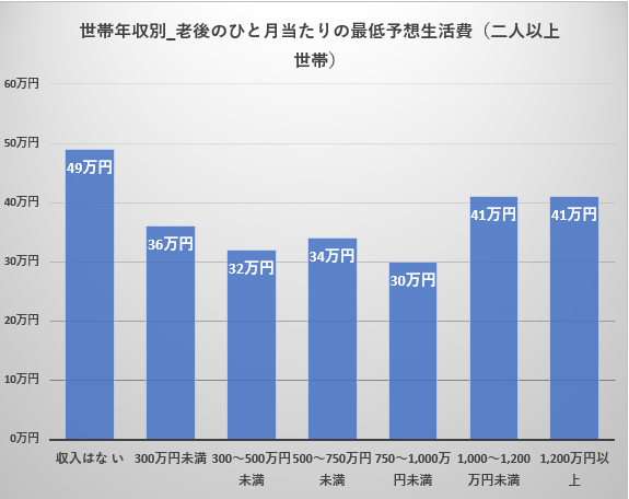 年収1200万円以上が世帯主の二人以上世帯はひと月当たり41万円の生活費が最低でもかかると予想しています。この金額はほかの年収帯と比較してもそこまで差がないといえそうです。このことから、二人以上世帯は幅広い年代で老後の生活費の予測が見込めている世帯が多いことが分かります。