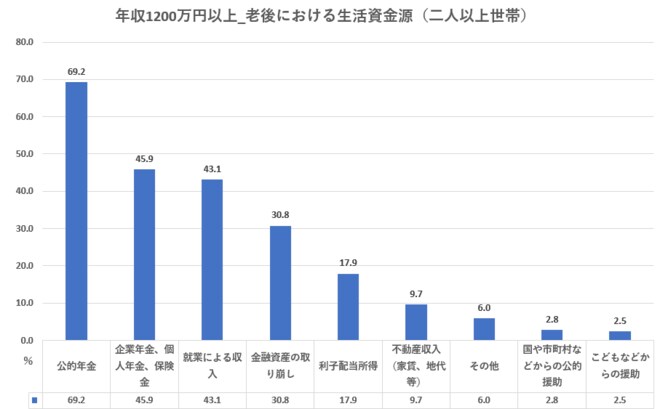 5000世帯を対象に金融資産や借入金、家計の状況などを聞いた調査「家計の金融行動に関する世論調査2023年」(金融広報中央委員会)から年収1200万円以上の世帯の回答を見ていきましょう。「老後における生活資金源」についてです。
