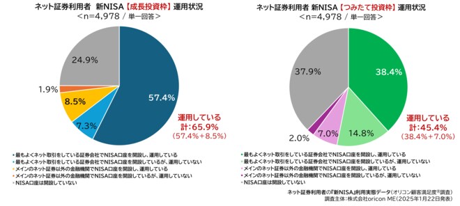 まず、肝心の新NISAの運用状況から見ていこう。結果は成長投資枠を利用している人の合計は65.9%に、つみたて投資枠では45.4%になった※。