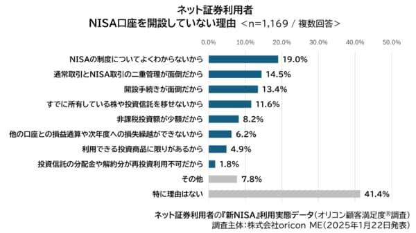同調査によれば、NISA口座を開設していない理由で最も多いのは「NISAの制度についてよくわからないから」で19.0%。次いで「通常取引とNISA取引の二重管理が面倒だから」(14.5%)、「開設手続きが面倒だから」(13.4%)と続く。