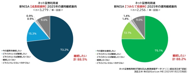 新NISAを実際に使ってみて、継続したいと考える人はどの程度いるのか。調査では、「継続したい」(=「今の運用を継続したい」+「どちらかといえば継続したい」)と回答した人が成長投資枠で88.5%、つみたて投資枠で88.2%と多数にのぼった。