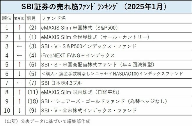 SBI証券の投信売れ筋ランキング2025年1月のトップは「eMAXIS Slim 米国株式(S&P500)」で前月トップの「eMAXIS Slim 全世界株式(オール・カントリー)」(通称:オルカン)と入れ替わった。第3位と第4位は、「SBI・V・S&P500インデックス・ファンド」と「iFreeNEXT FANG+インデックス」で前月と同じだった。第5位に前月の第6位から「SBI・S・米国高配当株式ファンド(年4回決算型)」が浮上した。また、前月はトップ10圏外だった「eMAXIS Slim 国内株式(日経平均)」が第8位に、「SBI・iシェアーズ・ゴールドファンド(為替ヘッジなし)」が第9位にジャンプアップした。一方、前月第8位の「アライアンス・バーンスタイン・米国成長株投信D 毎月Hなし予想分配」、第10位だった「Tracers S&P500ゴールドプラス」がトップ10落ちとなった。