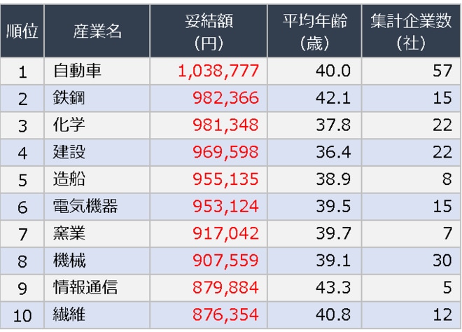 1位は「自動車」で103万8777円。5年連続で世界販売台数トップのトヨタ自動車を擁し、世界的に高い競争力を誇る日本の自動車産業。