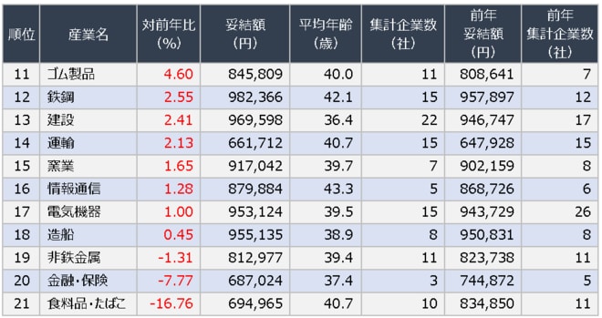 11位は「ゴム製品」で対前年比4.6%。前年妥結額から約3万7000円のアップだった。12位から14位には2%台の前年比アップ率の業種が並ぶ。12位「鉄鋼」は同2.55%増で約2万4000円増。13位の「建設」は同2.41%増で約2万3000円増。14位の「運輸」は同2.13%増で約1万4000円増だった。