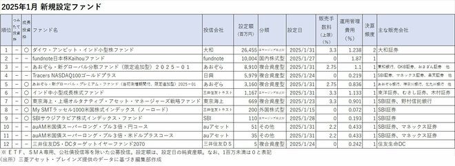 三菱アセット・ブレインズがまとめた2025年1月の公募投信(ETF、DC専用、SMA専用、公社債投信除く)の新規設定ファンド数は12本と前月(21本)から半減し、設定総額も約570億円と前月(約900億円)を下回った。新規設定額ランキング(設定額は設定日の純資産額)でトップは、大和アセットマネジメントの「ダイワ・アンビット・インド小型株ファンド」で約265億円だった。前月は6本のインド株ファンドが設定されたが、新規設定額は最大で21億円程度だったことと比較すると今回の新ファンドは大きな支持を集めたことになる。また、設定額で第2位になった「fundnote日本株Kaihouファンド」は独立系の運用会社fundnoteの直接販売ファンドで残高は当初募集上限の100億円に到達した。
