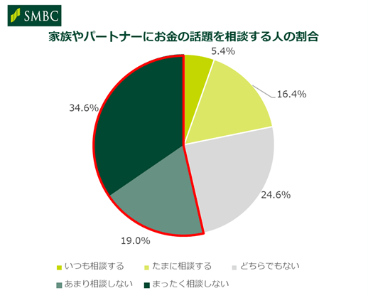 またお金の話題についても「相談しない」(=「あまり相談しない(19.0%)」+「まったく相談しない(34.6%)」)と回答した人が53.6%と半数を超えた。家族やパートナーといえども、お金の話は別なのだろうか。