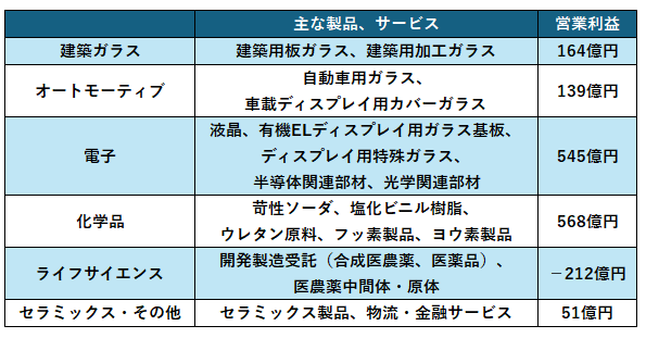 ガラス以外では、苛性ソーダや塩化ビニルといった化学品や、医薬品や農薬の開発製造受託サービスなどを手掛けます。利益貢献は小さめですが、耐火レンガなどのセラミックス製品や金融サービスなども行っています。