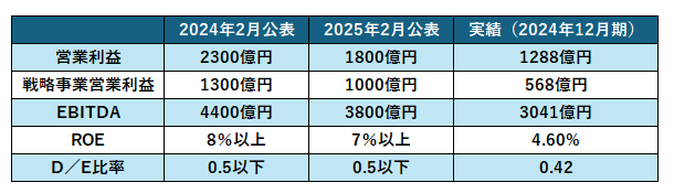 業績の悪化を受け、中期経営計画も下方修正されました。2026年12月期までに営業利益で2300億円を目指す計画でしたが、1800億円へ引き下げています。その他の目標も、D/E比率(負債資本倍率)を除き下方修正されています。