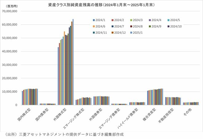 三菱アセット・ブレインズがまとめた2025年1月の公募ファンドの純資産残高は111兆5648億円で前月比1兆3378億円増加して史上最高を更新した。増加額は前月の3兆円超からは大きく減少した。資産別には「外国株式型」が約64兆919億円と前月から1兆8916億円増加した。前月は残高が2番目に大きかった「国内株式型」は約459億円残高が減少し12兆1466億円で第3位に後退。「複合資産型」が約639億円増加し約12兆2526億円で第2位に上がった。