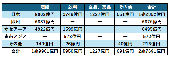 売り上げを分解すると、主力商品は酒類、主力市場は日本だと分かります。とはいえ、注力するのは海外です。ブランド力の強いビールを中心に、グローバルで拡大を目指します。