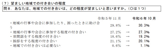 「地域での付き合いはどの程度が望ましいと思うか」との問いには「地域の行事や会合に参加したり、困ったときに助け合う」との回答が30.3%と最も高く、前年より0.5ポイント増加した(単一回答)。