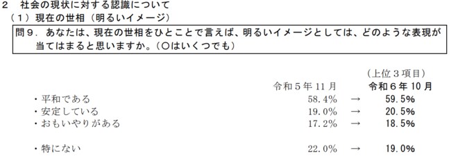 「明るいイメージ」として最も回答率が高かったのは「平和である」(59.5%)。1945年に終戦を迎えてから約80年間戦争を経験していない日本だからこその回答かもしれない。近年はロシアのウクライナ侵攻、イスラエルのガザ侵攻など紛争が相次いでおり、回答の説得力も増している。