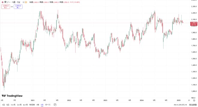 東ソーの株価はおおむね横ばいで推移しています。コロナ後の安値(1502円、2022年11月)からは上昇傾向にあり、2025年1月には一時2185円まで買われました。これはコロナ後の高値(2249円、2021年9月)まであと3%という水準です。