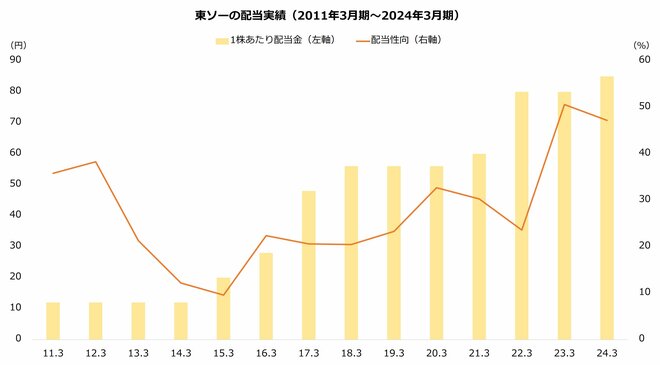 最後に株主還元を解説します。東ソーは2022年8月、公表した中期経営計画で株主還元方針へ言及しました。2025年3月期までの3カ年で、配当金は配当性向30%を目安に、自社株買いは機動的に実施するというものです。
