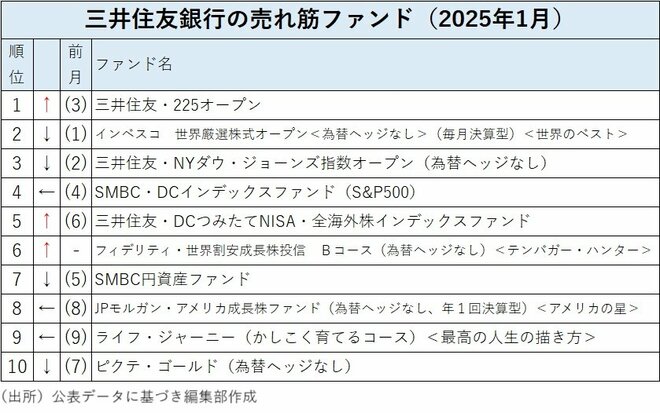 三井住友銀行の投信売れ筋ランキングの2025年1月のトップは前月の第3位から「三井住友・225オープン」が浮上した。前月トップの「インベスコ 世界厳選株式オープン<為替ヘッジなし>(毎月決算型)<世界のベスト>」が第2位に、前月第2位の「三井住友・NYダウ・ジョーンズ指数オープン(為替ヘッジなし)」が第3位にそれぞれ後退した。また、2025年1月7日から新規に取り扱いが始まったばかりの「フィデリティ・世界割安成長株投信 Bコース(為替ヘッジなし)<テンバガー・ハンター>」が第6位に食い込んだ。