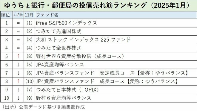 ゆうちょ銀行・郵便局の売れ筋の2025年1月のトップは「iFree S&P500インデックス」で、昨年5月以来1位を継続している。第2位以下は「つみたて先進国株式」、「大和 ストック インデックス225ファンド」、「つみたて全世界株式」で第4位まで11月と同じだった。ただ、9月には第4位だった「つみたて日本株式(TOPIX)」は1月は順位を落として第9位に後退した。また、「野村世界6資産分散投信(成長コース)」が第8位から第5位にジャンプアップした。第10位から第8位に浮上した「JP4資産バランスファンド 成長コース」も含めて、バランス型ファンドも積極的に収益を狙うファンドがランクを上げている。