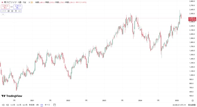 そして2025年2月、今期(2025年3月期)の第3四半期の決算が公表されると、株価は上昇し上場来高値(2591円)を更新しました。前年同四半期比で大幅な増益が好感されたようです。