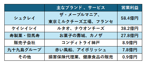 事業は主に地域別の連結子会社で整理されています。「シュクレイ」は東京、「ケイシイシイ」は北海道、「寿製菓・但馬寿」は山陰、「九十九島グループ」は九州が中心です。また「販売子会社」はグループで製造した菓子の販売、「その他」は損害保険代理業などで構成されます。