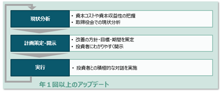 この要請のなかでは、経営層が主体となり、自社の資本コストや資本収益性を把握し分析・評価すること、改善の方針・目標・期間を策定し投資家に分かりやすく開示すること、さらに投資家との積極的な対話を行い、取組みをアップデートしていくことについて、継続的な実施が求められています。