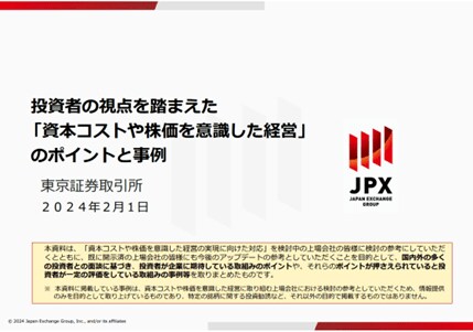 また、東証は、2024年2月1日、資本コストや株価を意識した経営について、投資家らが期待している取組みのポイントや、それらのポイントが押さえられていると投資家からの支持を得た取組みの事例集を公表しました。このポイント・事例集は、東証が中長期の企業価値向上を重視する国内外90社以上の機関投資家と意見交換した結果をまとめたものです。