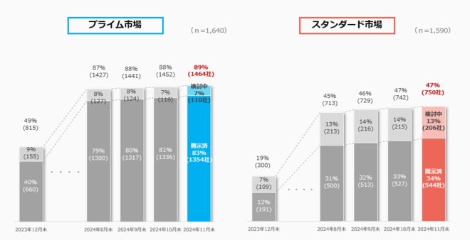 「資本コストや株価を意識した経営の実現に向けた対応」について、2024年11月末時点で、プライム市場の89%、スタンダード市場の47%が開示(検討中を含む)するなど、多くの企業において取組みへの着手が進んできています。