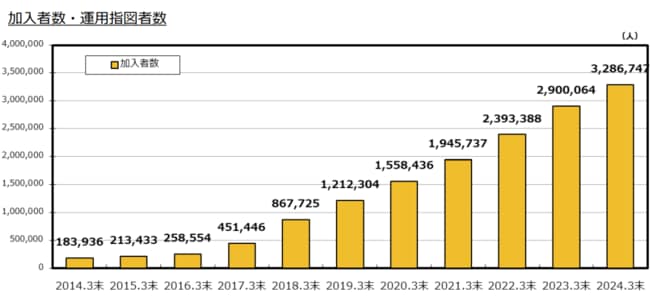iDeCoの加入者数は約328万人です(出所:「確定拠出年金統計資料(2024年3月末)」運営管理機関連絡協議会、以下同)。この人数が多いか少ないか、いまいちピンとこないという人もいるでしょう。