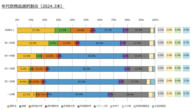 資産の受け取り時期に差し掛かる60代以上の人たちは、既に預貯金に預け替えていると見え、預貯金の割合が最も高くなっています。