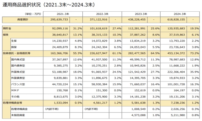 iDeCoで元本確保型商品が選ばれている割合は、下表のとおりです。表の右端が最新の状況ですが、預貯金が約20%、保険が約6%となっています(2024年3月末時点)。合わせると元本確保型の割合は約26%となります。