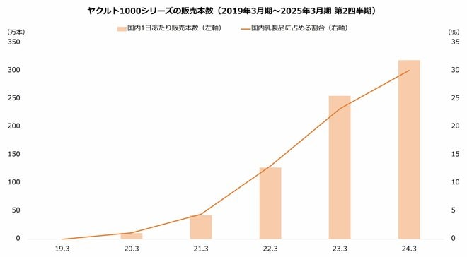 比較的若い商品ですが、ヤクルト1000シリーズは主力となっています。1日あたり販売本数は300万本に達し、国内乳製品全体の約3割を占めるまでになりました。1年では10億本以上が売れる計算です。