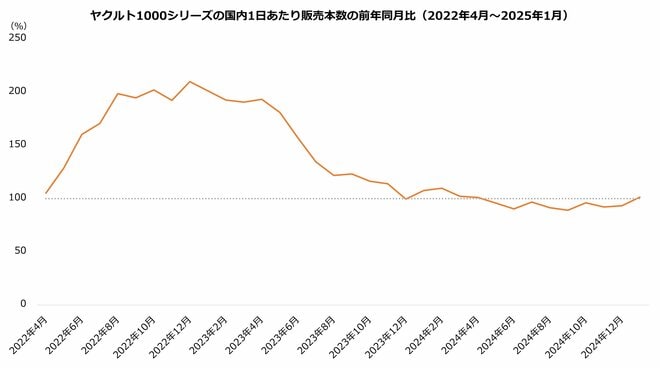 ただし、販売は減速も見られます。月次で確認すると、ヤクルト1000シリーズは2022年まで前年比2倍の高い成長が続きました。しかし、2023年に入ると成長は鈍化し、2024年は前年を下回ることが常態化します。2025年1月は、9カ月ぶりに前年を上回りました。