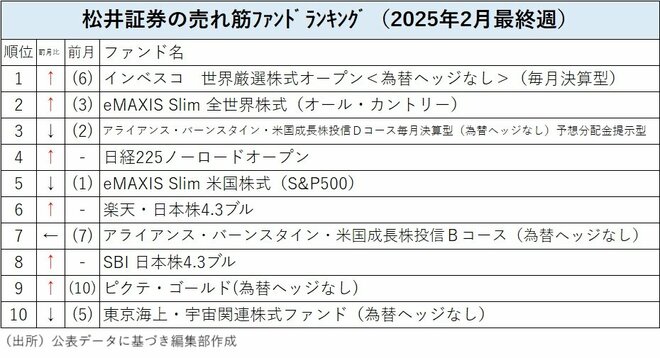松井証券の投信売れ筋ランキングの2025年2月のトップは前月の第6位から「インベスコ 世界厳選株式オープン<為替ヘッジなし>(毎月決算型)」(愛称:世界のベスト)がジャンプアップした。第2位には前月3位の「eMAXIS Slim 全世界株式(オール・カントリー)」(通称:オルカン)が浮上。前月トップだった「eMAXIS Slim 米国株式(S&P500)」は第5位にまで後退し、前月第2位だった「アライアンス・バーンスタイン・米国成長株投信Dコース毎月決算型(為替ヘッジなし)予想分配金提示型」は第3位になった。また、第4位にはトップ10圏外から「日経225ノーロードオープン」が飛び込んだ。売れ筋上位に大きな変動が起こっている。2月にランキングが上昇したのは全世界株式と国内株に投資するファンドだった。