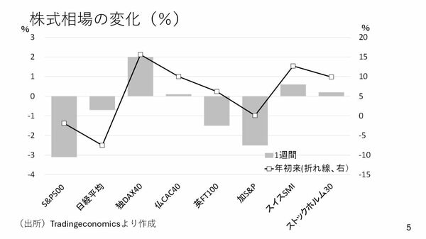 まず株式市場を見ていきましょう。過去1週間の下落幅と年初来のパフォーマンスを見比べてみます。