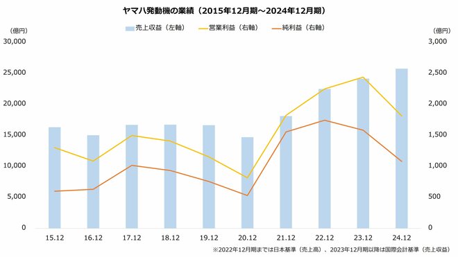 最後に業績を確認しましょう。ヤマハ発動機は、アフターコロナの2021年12月期以降に売り上げは拡大しました。しかし、利益面は苦戦しています。