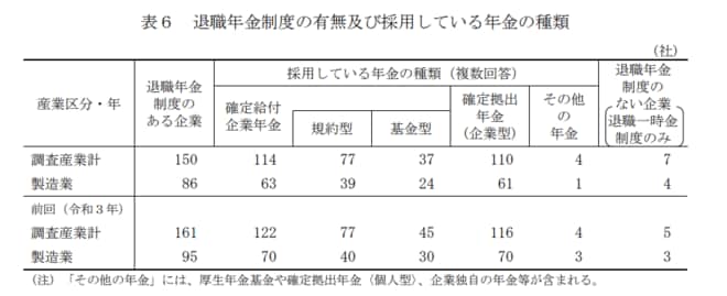 なお、退職年金制度とひと言でいえども幾つか種類がある。主な種類ごとの導入状況は下表のとおりだ。