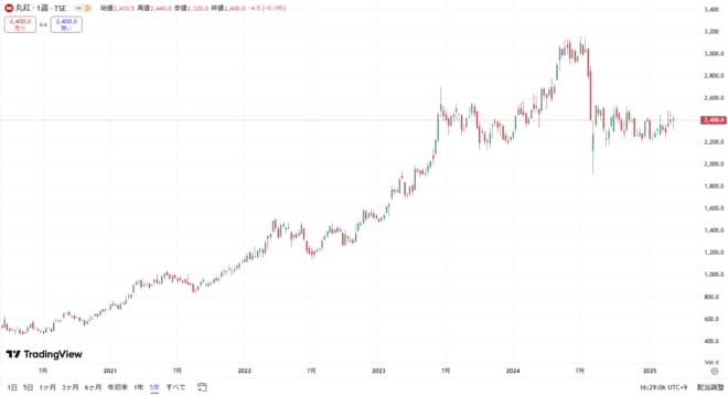 商社株は配当利回りの高さからも人気です。丸紅は今期(2025年3月期)は1株あたり配当金95円を予定しており、配当利回りは約4%となっています。