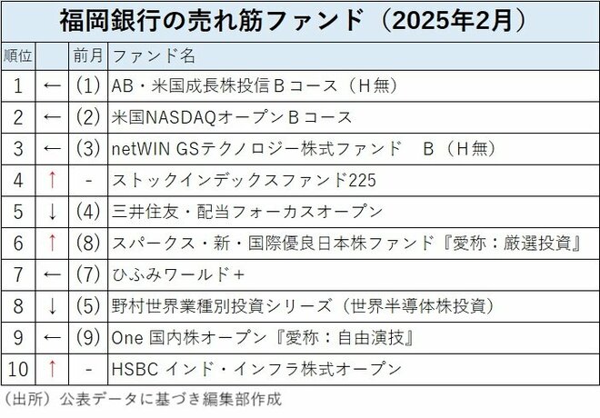 福岡銀行の売れ筋(店頭販売件数ランキング)の2025年2月のトップ3は前月と同じで「アライアンス・バーンスタイン・米国成長株投信Bコース(為替ヘッジなし)」、「米国NASDAQオープンBコース」、「netWIN GSテクノロジー株式ファンドB(為替ヘッジなし)」だった。第4位に前月のトップ10圏外から「ストックインデックスファンド225」がジャンプアップし、第6位には前月第8位の「スパークス・新・国際優良日本株ファンド『愛称:厳選投資』」がランクアップするなど、国内株ファンドへの注目度が増している。