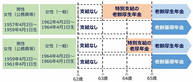 老齢厚生年金の受給開始年齢の60歳から65歳への引き上げは段階的に行われており、生年月日に応じて、60年代の前半に老齢厚生年金を受け取れる人がいます。これを「特別支給の老齢厚生年金」といいます。