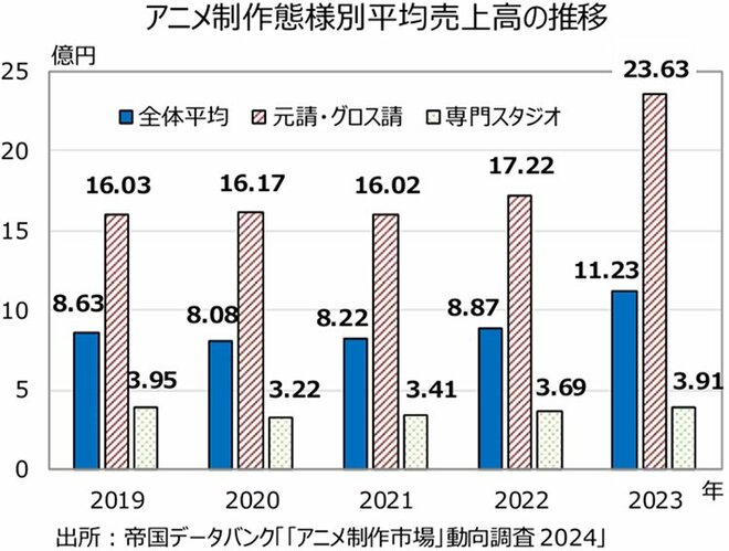 神様:アニメ制作会社の業績も向上しています。2023年(1~12月期決算)において、制作態様別に平均売上高を見ると、直接制作を受託し完成させる能力を持つ「元請・グロス請」では前年比で37.2%増となる23.63億円、下請としてアニメ制作に携わる「専門スタジオ」では前年比で6%増となる3.91億円となりました。