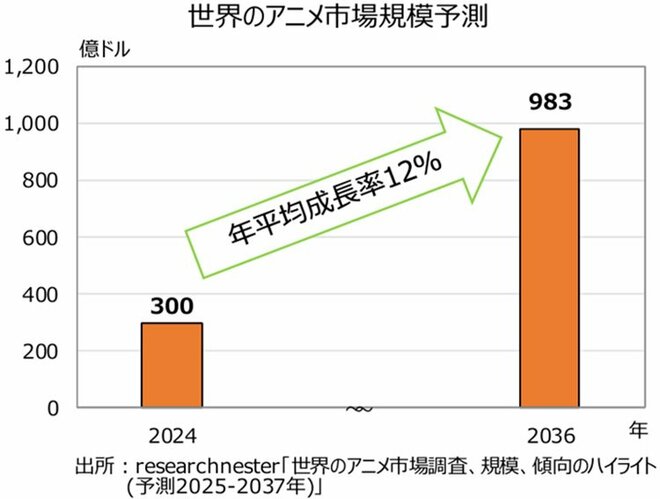 神様:世界のアニメ市場規模を見ると、2024年の300億ドルから2036年には983億ドルまで拡大し、年率12%で成長を続けると予測されています。今、日本のアニメは世界中でブームとなっており、2024年時点でシェア40%以上を誇ります。今後も高いシェアを維持するでしょう。