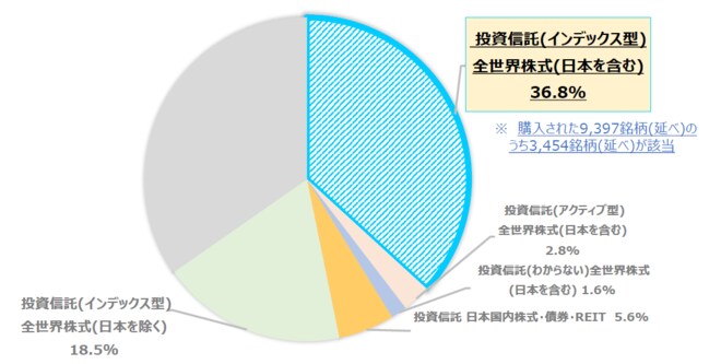 ※ つみたて投資枠で購入された銘柄数(n=9,397) 一人あたり購入銘柄上位5銘柄を集計しているため、n値は延べ銘柄数。購入銘柄数及び購入銘柄のタイプが「わからない・不明」の回答を除く