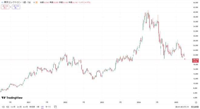 東京エレクトロンの株価は下落傾向が続いています。2023年以降は上げ足を早め、2024年4月には上場来高値となる4万860円まで買われました。しかし、7月以降は一転して下落トレンドとなり、足元では2万円前後で取引されています。