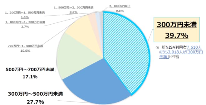 その結果によると、新NISA利用者は「年収300万円未満」が最も多く、全体の39.7%を占めた。続いて「300万円〜500万円未満」の層が27.7%を占めており、これら二つの年収帯で全体の約7割を占めている。以下、0万~2000万円以上と年収帯は分散しており、新NISA利用者の年収分布は幅広いことが明らかになった。