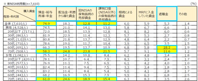 続いて、年代別の傾向を詳しく見ていこう。特徴的な傾向として60代、70代男性は「退職金」を活用して新NISAで金融商品を購入している割合が高い。特に60代男性は18.2%にも上っている。