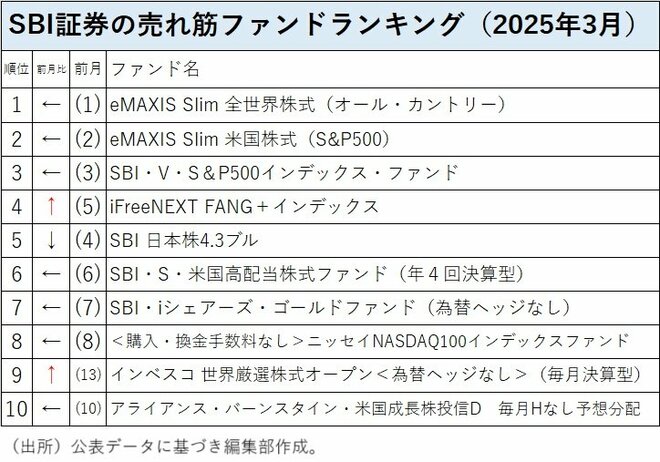 SBI証券の投信売れ筋ランキングの2025年3月のトップ3は前月と同様に「eMAXIS Slim 全世界株式(オール・カントリー)」(通称:オルカン)、「eMAXIS Slim 米国株式(S&P500)」、「SBI・V・S&P500インデックス・ファンド」の順だった。第4位には前月の第5位から「iFreeNEXT FANG+インデックス」が浮上し、前月は第4位だった「SBI 日本株4.3ブル」は第5位に後退した。前月に第9位だった「eMAXIS Slim 国内株式(日経平均)」がトップ10圏外に落ちるなど日本株ファンドの後退が目立つ。また、「インベスコ 世界厳選株式オープン<為替ヘッジなし>(毎月決算型)」がトップ10圏外から第9位にジャンプアップした。