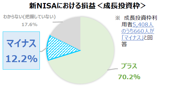 調査からは、成長投資枠の新NISA1年目の損益はプラスの人が70.2%、マイナスの人が12.2%という結果となった。