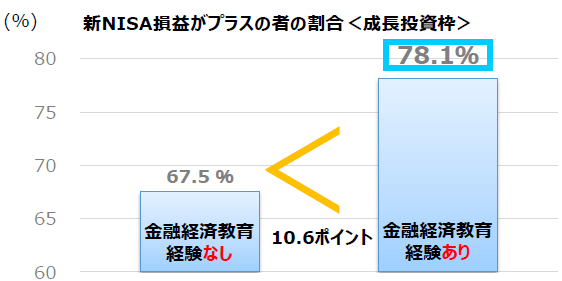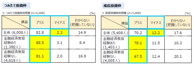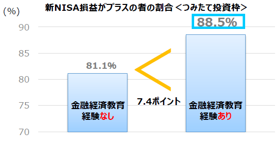 新NISA損益がプラスの人の場合で見てみよう。金融経済教育の経験ありの利用者は、つみたて投資枠で88.5%、成長投資枠で78.1%がプラスの収益をあげている。