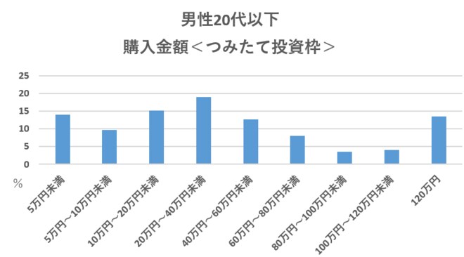 男性20代以下のつみたて投資枠の購入金額は、「20万円~40万円未満」が19.1%と最も多かった。月額に換算すると約1万6000~3万3000円の積立額となる。