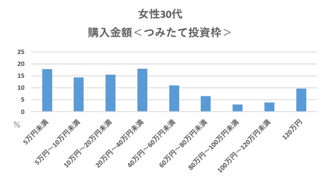 女性30代の「つみたて投資枠」購入金額は「20万円~40万円未満」が1位で18.1%を占めた。毎月の積立額に置き換えると約1万6000~3万3000円となる。