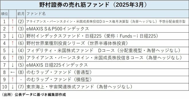 野村證券の投信売れ筋ランキングの2025年3月は、トップに前月第2位から「アライアンス・バーンスタイン・米国成長株投信Dコース毎月決算型(為替ヘッジなし)予想分配金提示型」が上がった。第2位には前月の第3位から「eMAXIS S&P500インデックス」が繰り上がり、前月トップだった「野村インデックスファンド・日経225(愛称:Funds-i 日経225)」が第3位に落ちた。前月は第6位だった「野村世界業種別投資シリーズ(世界半導体株投資)」が第4位に浮上した。前月第7位にまで順位を上げた「東京海上・宇宙関連株式ファンド(為替ヘッジなし)」は第10位に下がった。