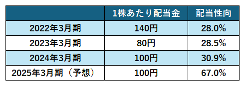 期間中は減配があったものの、配当性向はおおむね目標どおりで推移しています。また2025年3月期は、配当金を維持する一方で純利益の減少を見込むことから、配当性向は60%台後半となる予想です。